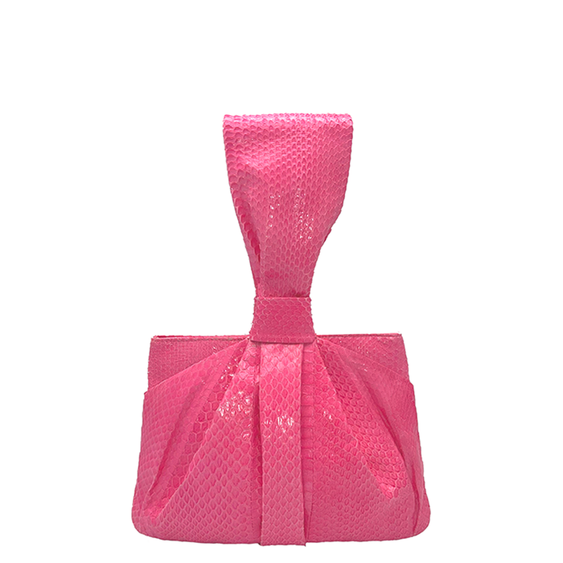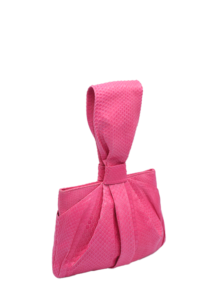 The Maria is a unique draped handle bag made with glazed non-endangered Elaphe snake. The bag has spring hinge closure and is lined with hot pink satin, and features a single card slot, and a full length zipper pocket with Sharon’s signature brass poodle.