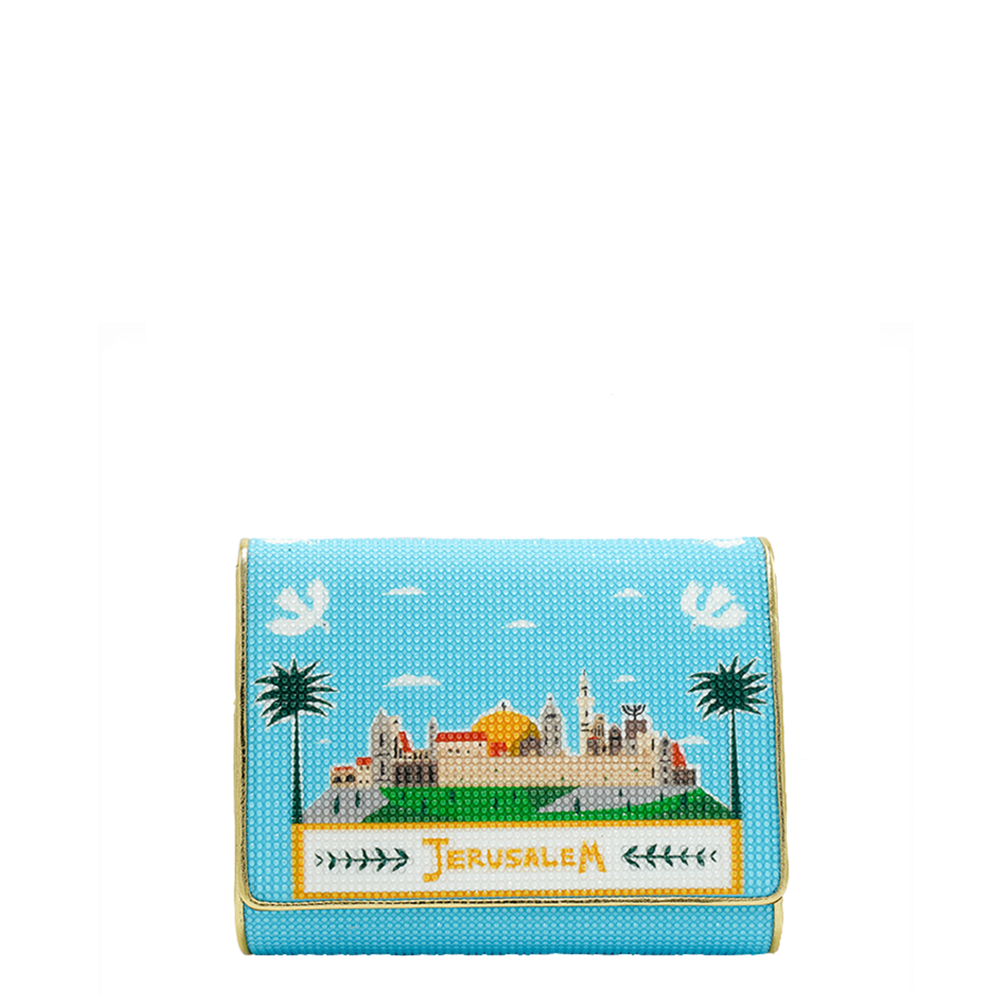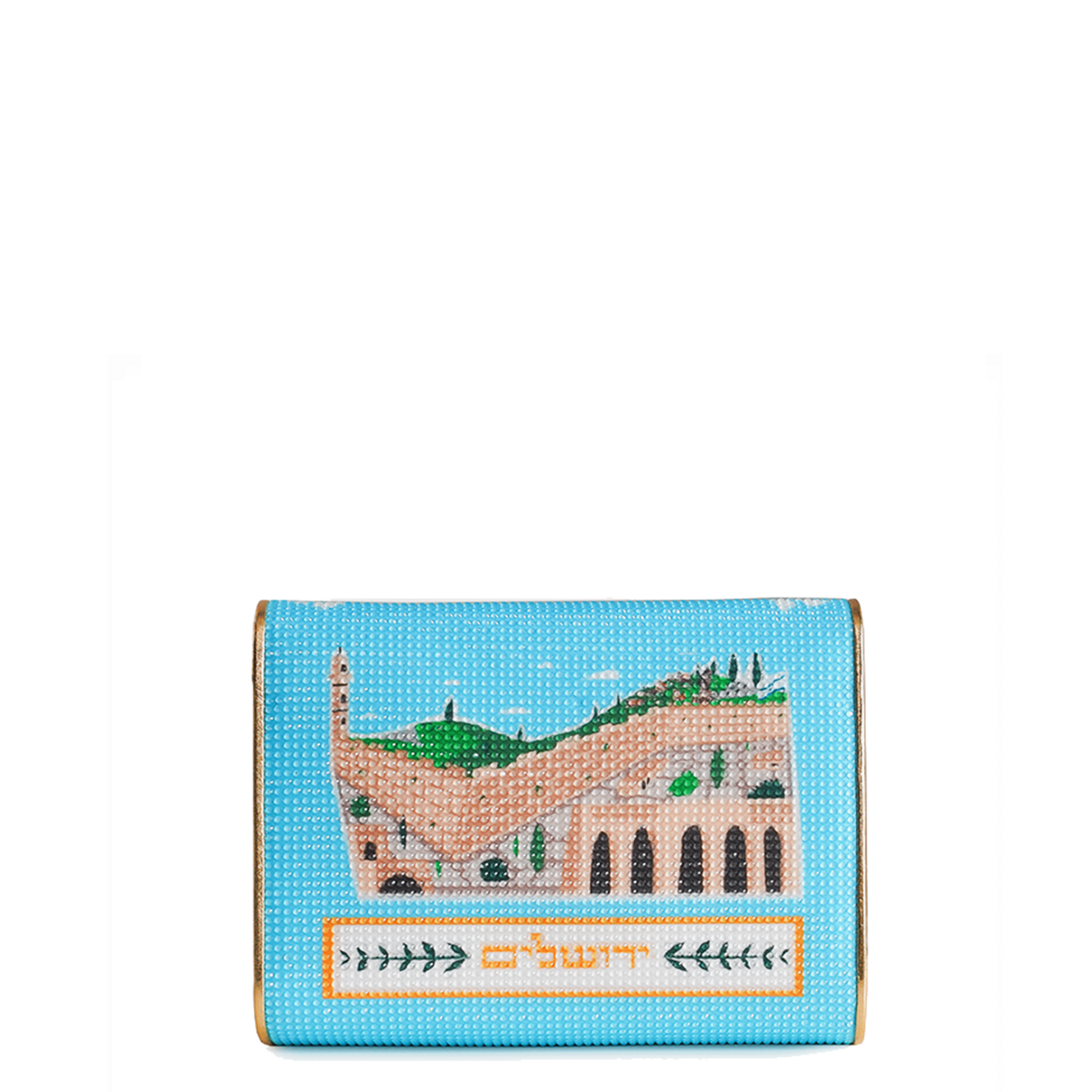 This Marilyn has a beautiful printed graphic of Jerusalem digitally printed on silk blend satin and the fully covered with European heat set crystals. It can be used as either a clutch or crossbody bag using its detachable strap. The bag is lined in a hot pink silk blend satin, has a lambskin leather trim, and features a double card holder, phone pocket and a zippered pocket that has Sharon’s signature brass poodle.