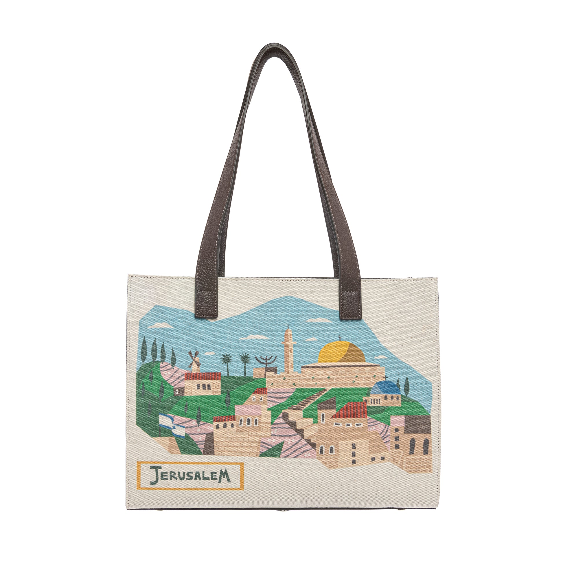 Italian linen body tote trimmed in calfskin leather printed front and back, fully lined in pink suede with a zipper pocket and a zipper closing both using brass poodles. the graphic is an original design created by a Shenkar College of Design, Art and Engineering in Israel, student.
