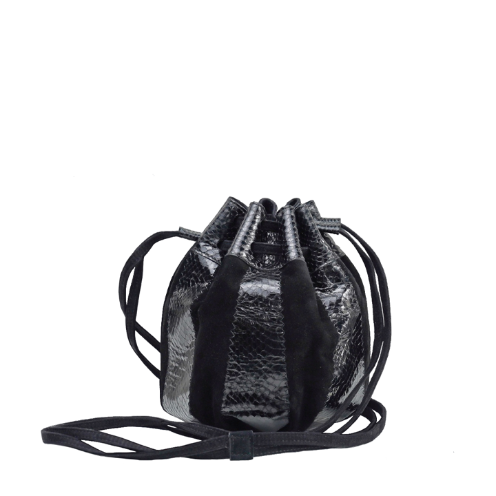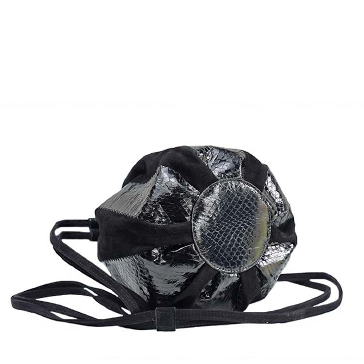 The Brigitte bag is made of soft lambskin suede, non-endangered Elaphe/snake, and a hot pink satin lining. The bucket bag has a unique spherical design and features a full length zipper pocket with Sharon’s signature brass poodle.