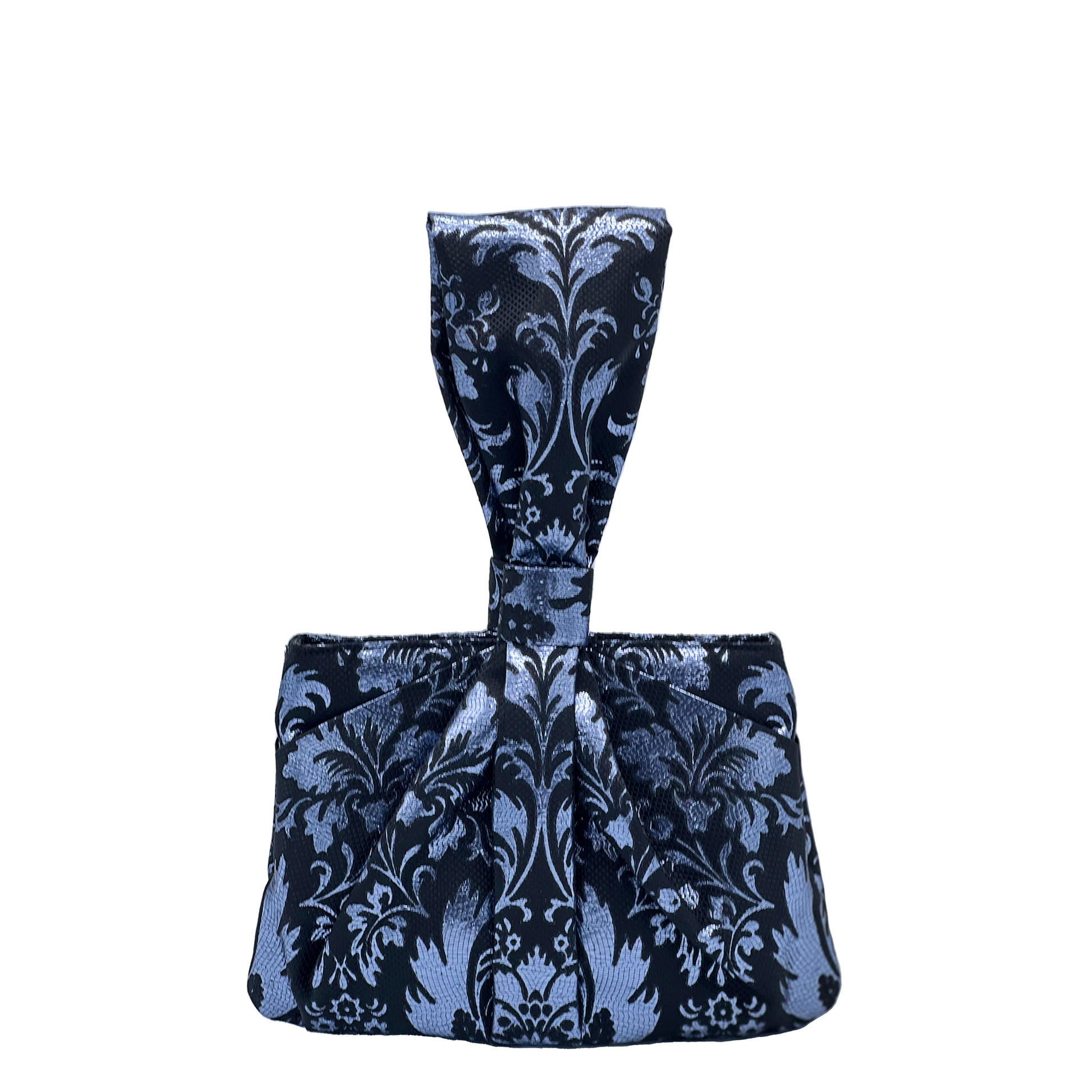 The Brocade Maria is made of silk blend jacquard and has a unique draped handle. The bag has a spring hinge closure and is lined with hot pink satin, features a single row card slots, and a zipper pocket inside with Sharon’s signature brass poodle.
