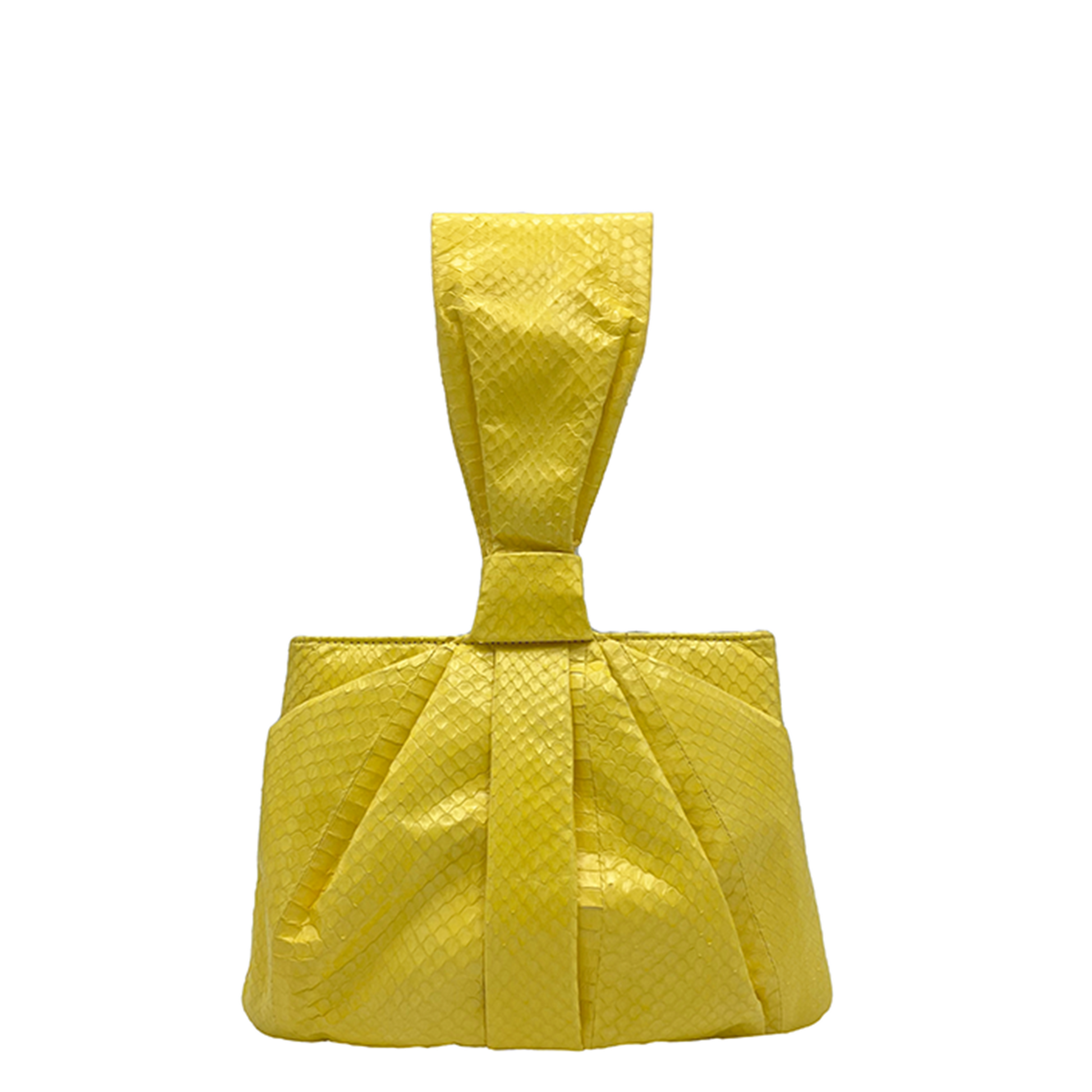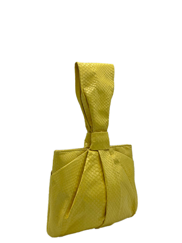 The Maria is a unique draped handle bag made with glazed non-endangered Elaphe snake. The bag has spring hinge closure and is lined with hot pink satin, and features a single card slot, and a full length zipper pocket with Sharon’s signature brass poodle.