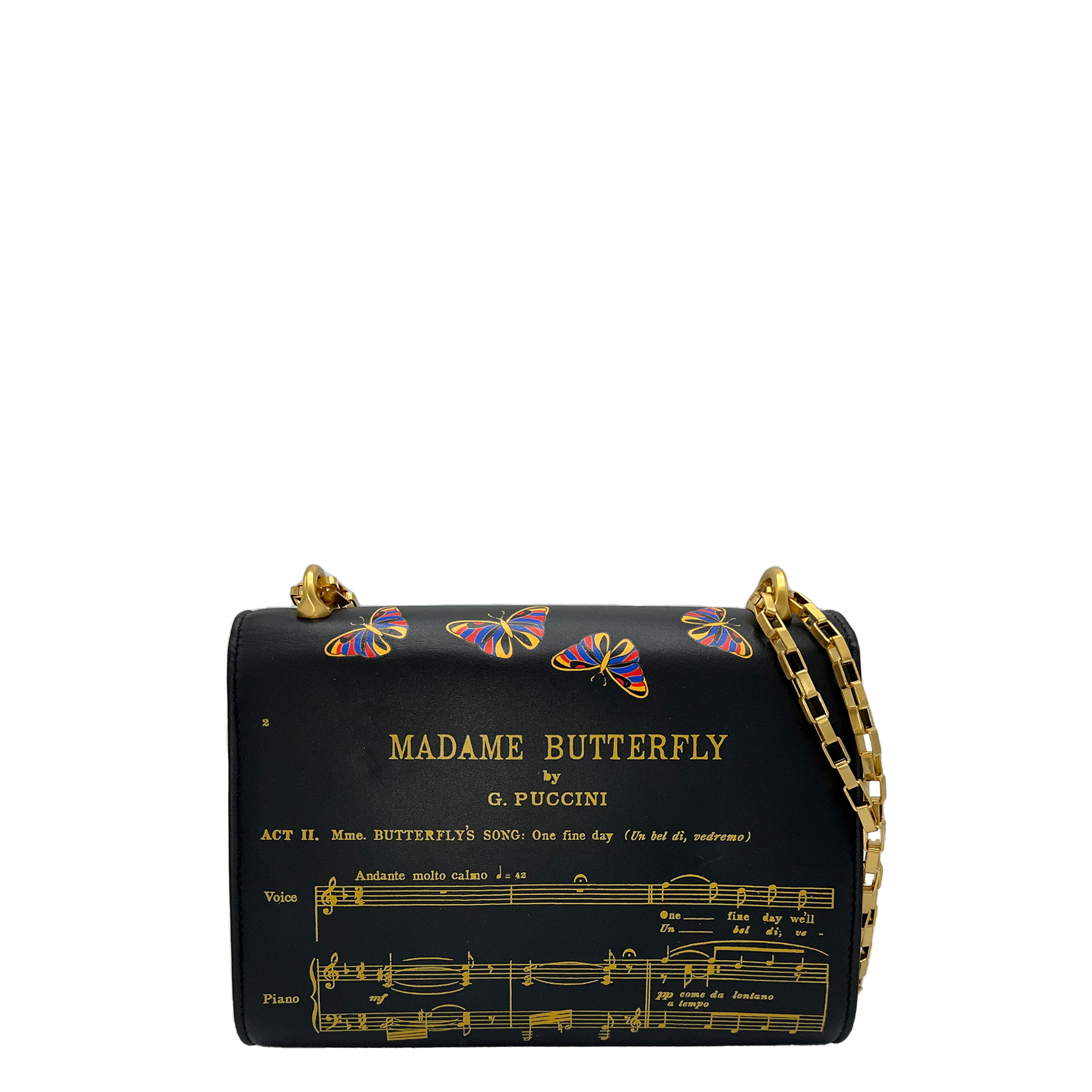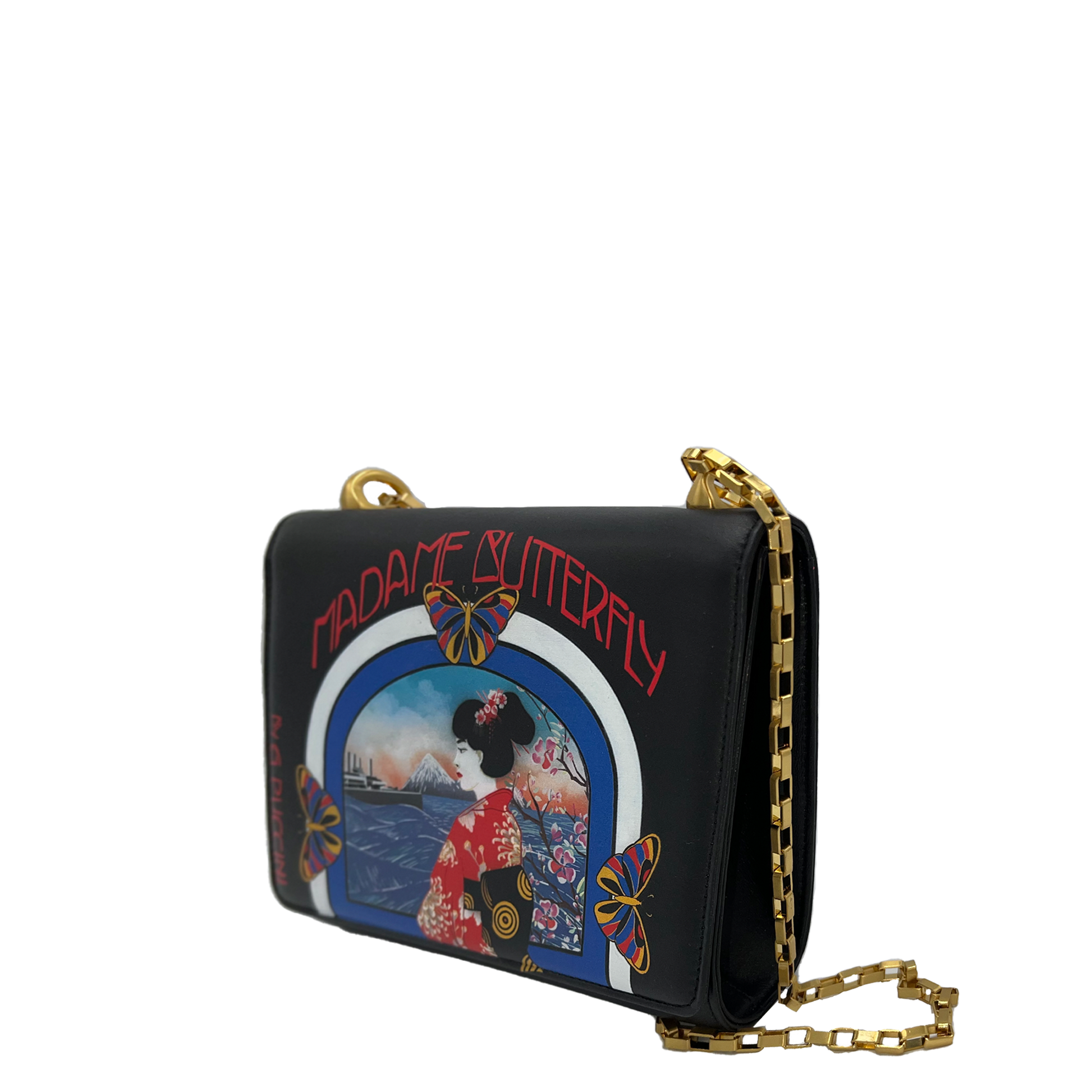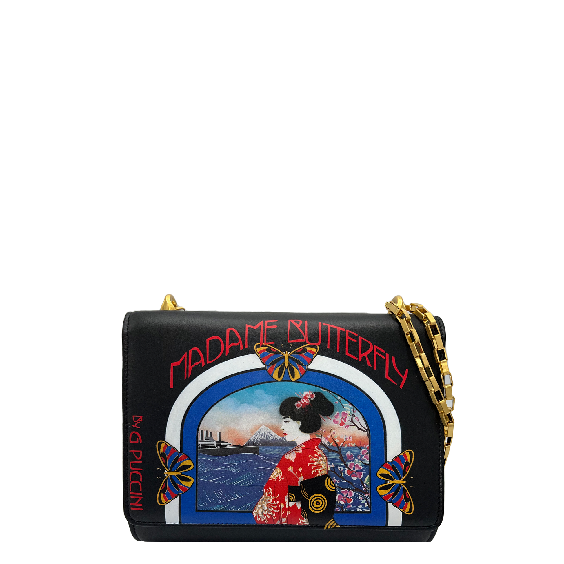 The Roberta Madame Butterfly is an elegant shoulder bag that is printed on luxurious lambskin and has a double brushed gold chain that can be worn either short or long on the shoulder. The Madame Butterfly is lined in a hot pink silk blend satin, has a lambskin leather trim, and features a double card holder, phone pocket and a zippered pocket that has Sharon’s signature brass poodle.