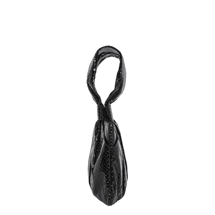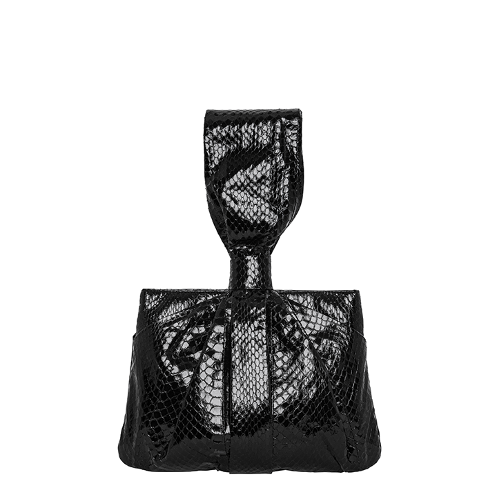 The Maria is a unique draped handle bag made with metallic glazed non-endangered Elaphe snake. The bag has spring hinge closure and is lined with hot pink satin, and features a single card slot, and a full length zipper pocket with Sharon’s signature brass poodle.