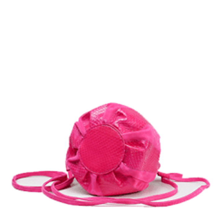 The Brigitte bag is made of all non-endangered Lambskin suede, Elaphe/water snake, and a hot pink satin lining. The Bucket Bag has a unique spherical design that is perfect for everyday life, as well as features a full length zipper pocket with Sharon’s signature brass poodle.