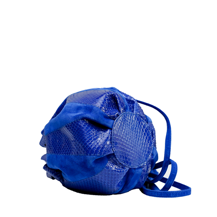 The Brigitte bag is made of soft lambskin suede, non-endangered Elaphe/snake, and a hot pink satin lining. The bucket bag has a unique spherical design and features a full length zipper pocket with Sharon’s signature brass poodle.