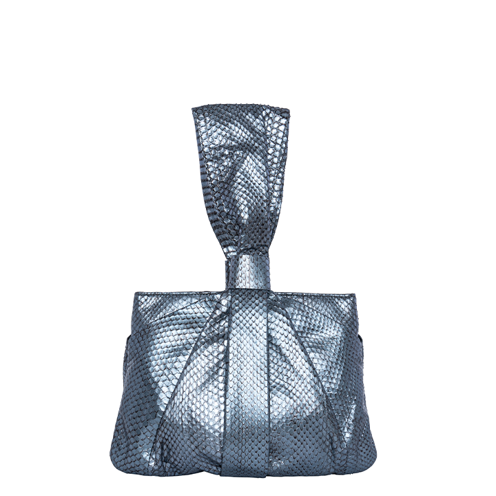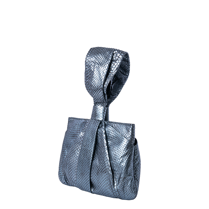 The Maria is a unique draped handle bag made with metallic glazed non-endangered Elaphe snake. The bag has spring hinge closure and is lined with hot pink satin, and features a single card slot, and a full length zipper pocket with Sharon’s signature brass poodle.