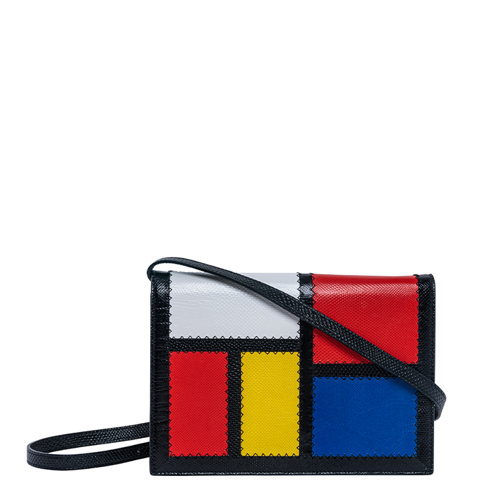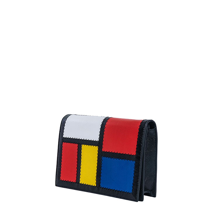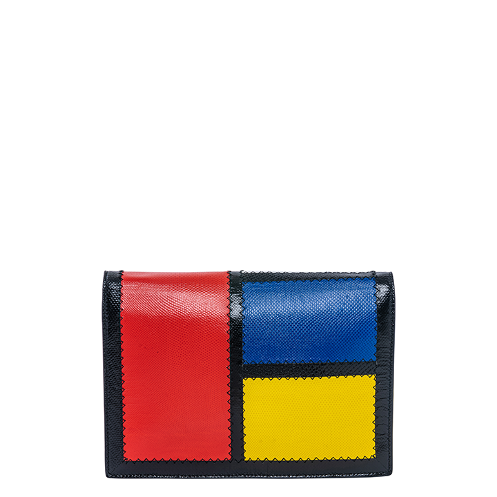 Inspired by the artist Mondrian, the Natalie has vibrant primary color patchwork on a black frame, made of non-endangered Karung. The Natalie is lined in hot pink suede and features a double card slot, a phone pocket, a removable crossbody strap, and a full length zipper pocket featuring Sharon’s signature brass poodle.