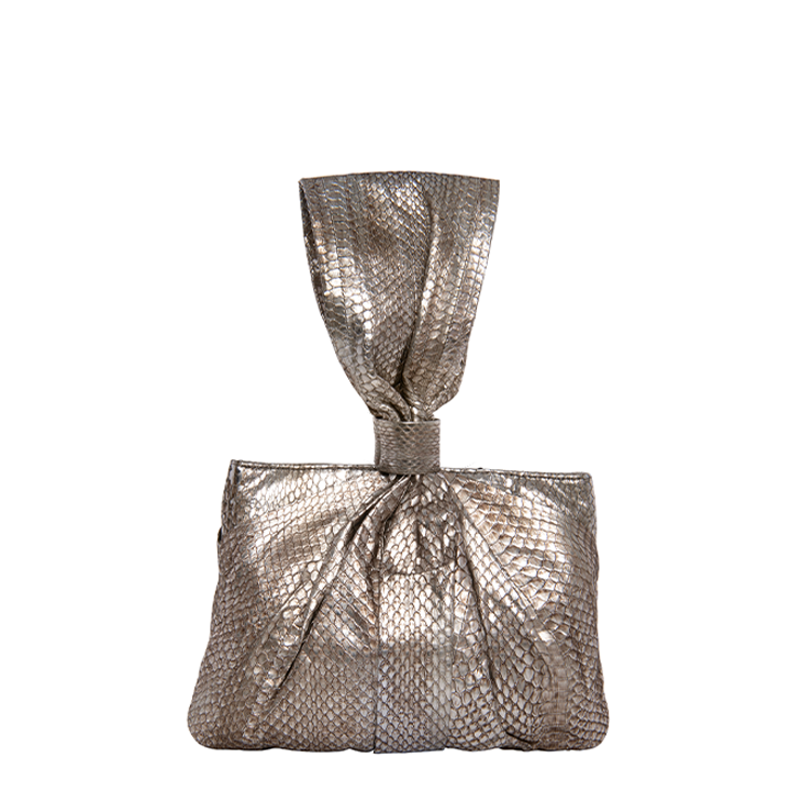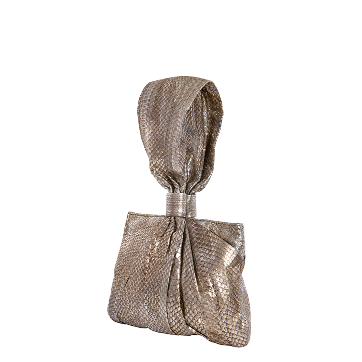 The Maria is a unique draped handle bag made with metallic glazed non-endangered Elaphe snake. The bag has spring hinge closure and is lined with hot pink satin, and features a single card slot, and a full length zipper pocket with Sharon’s signature brass poodle.