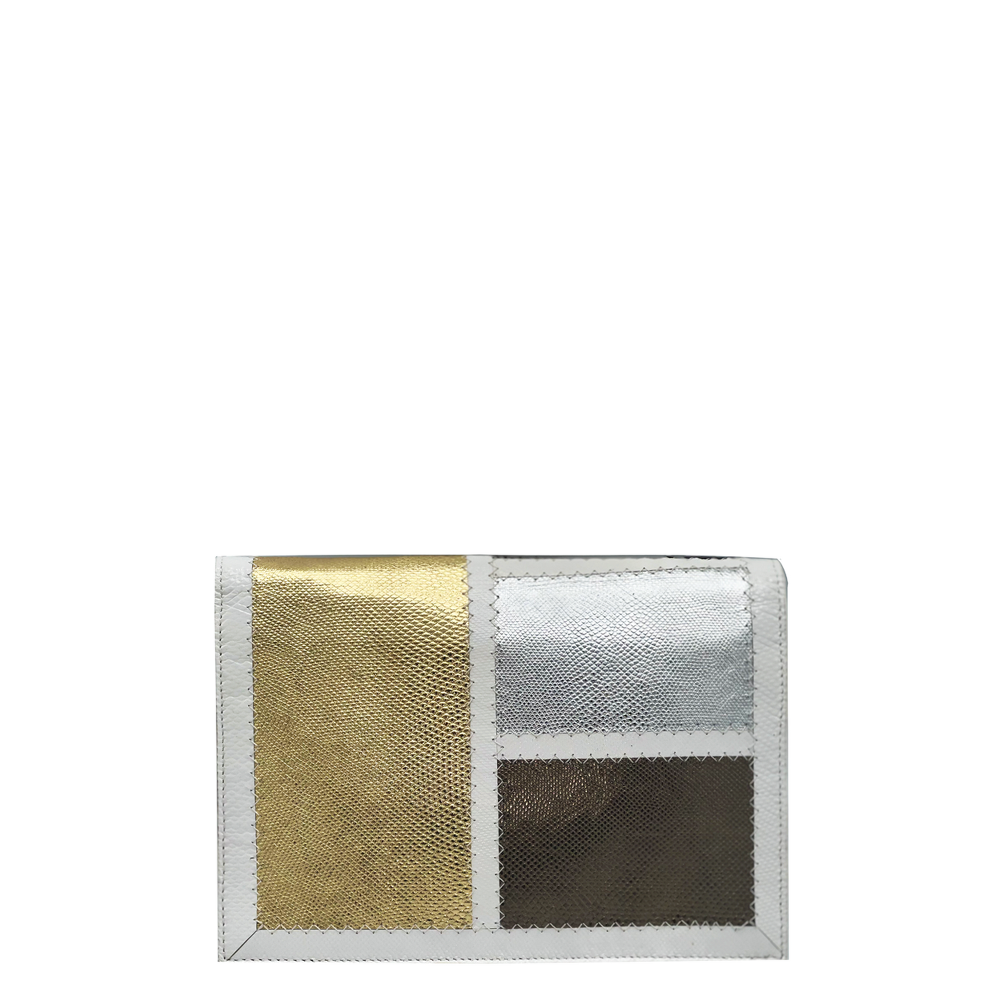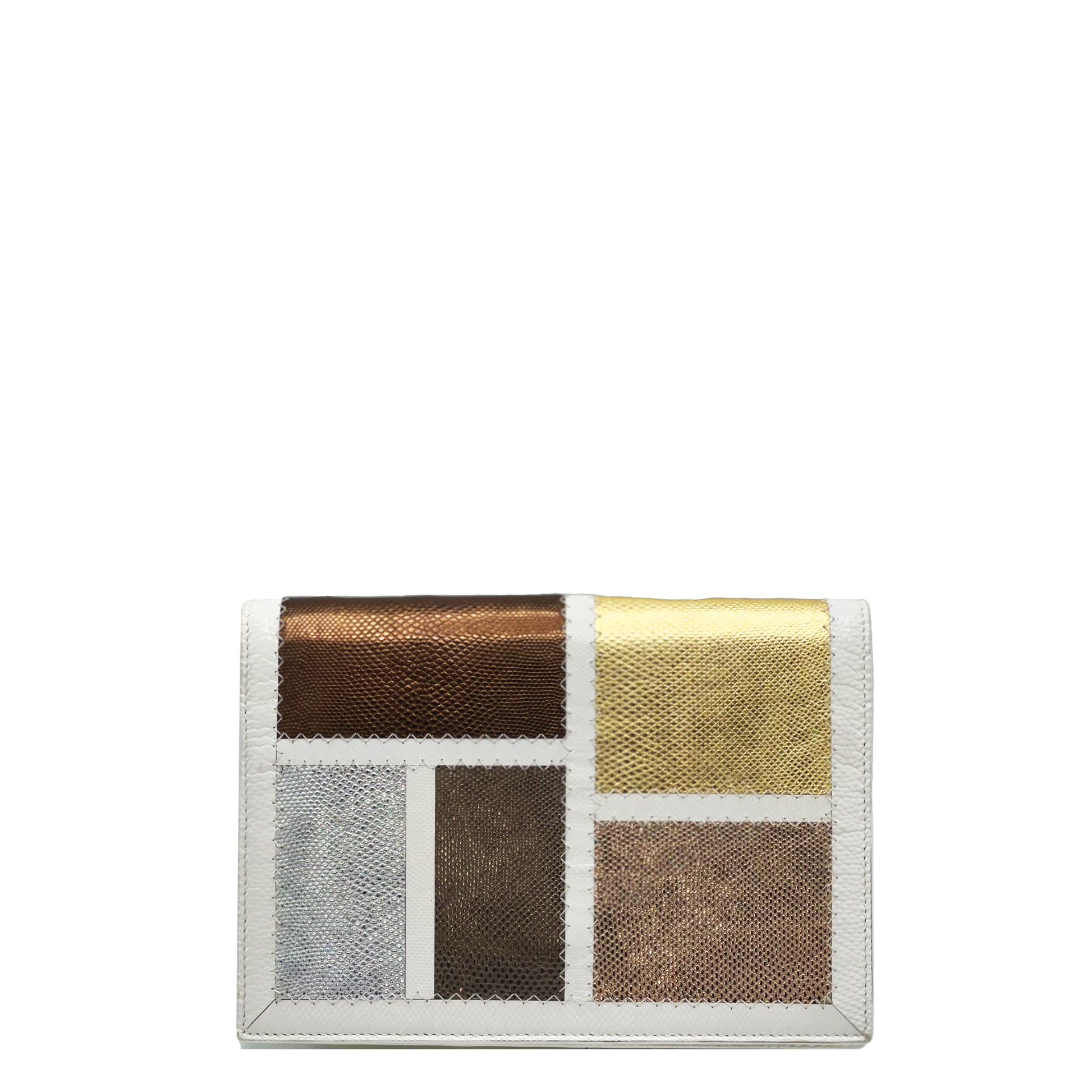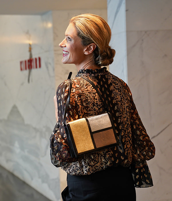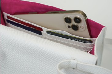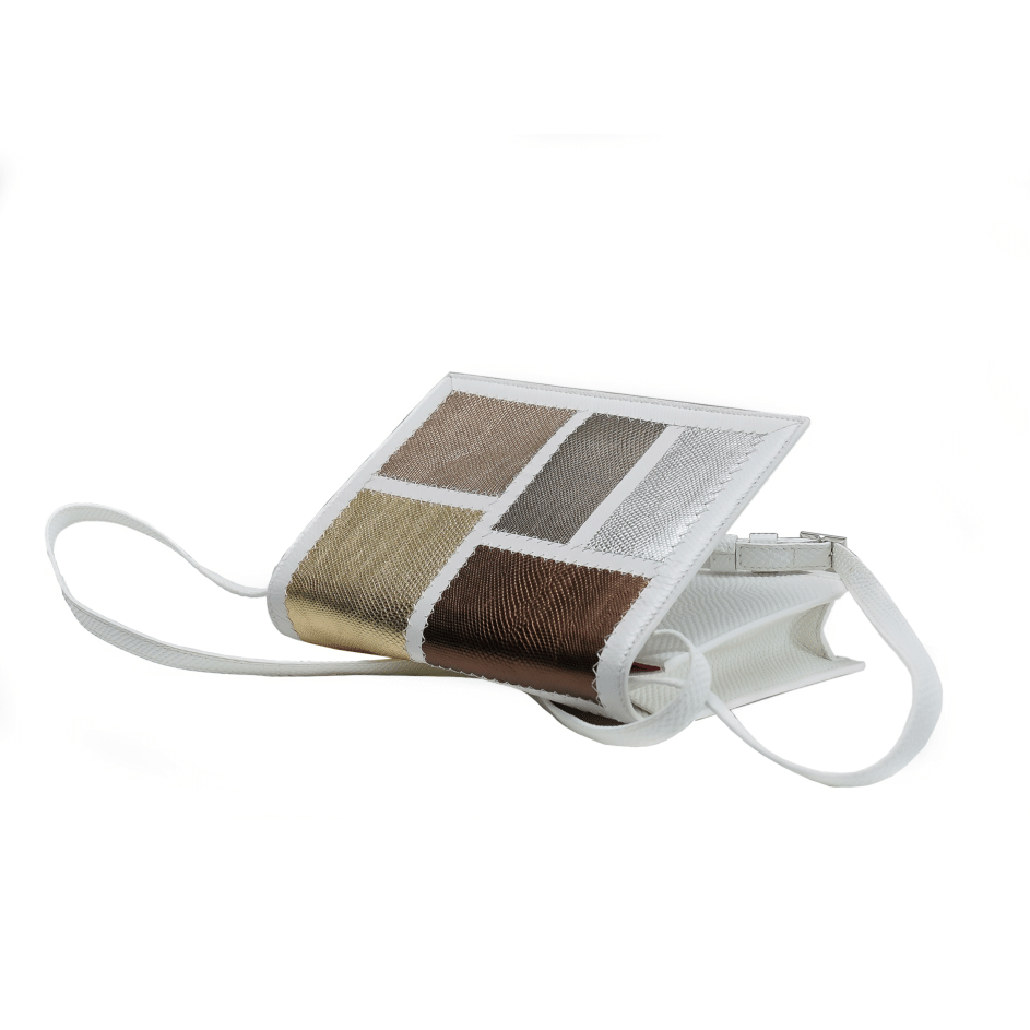 The Natalie bag was nominated for the prestigious Design Excellence Award from the Accessories Council. The bag showcases classic metallic color patchwork with a white frame made of non-endangered Karung. The Natalie is lined in hot pink suede and features a double card slot, a phone pocket, a removable crossbody strap, and a full length zipper pocket featuring Sharon’s signature brass poodle.