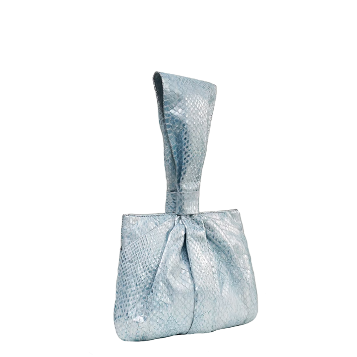 The Maria is a unique draped handle bag made with metallic glazed non-endangered Elaphe snake. The bag has spring hinge closure and is lined with hot pink satin, and features a single card slot, and a full length zipper pocket with Sharon’s signature brass poodle.