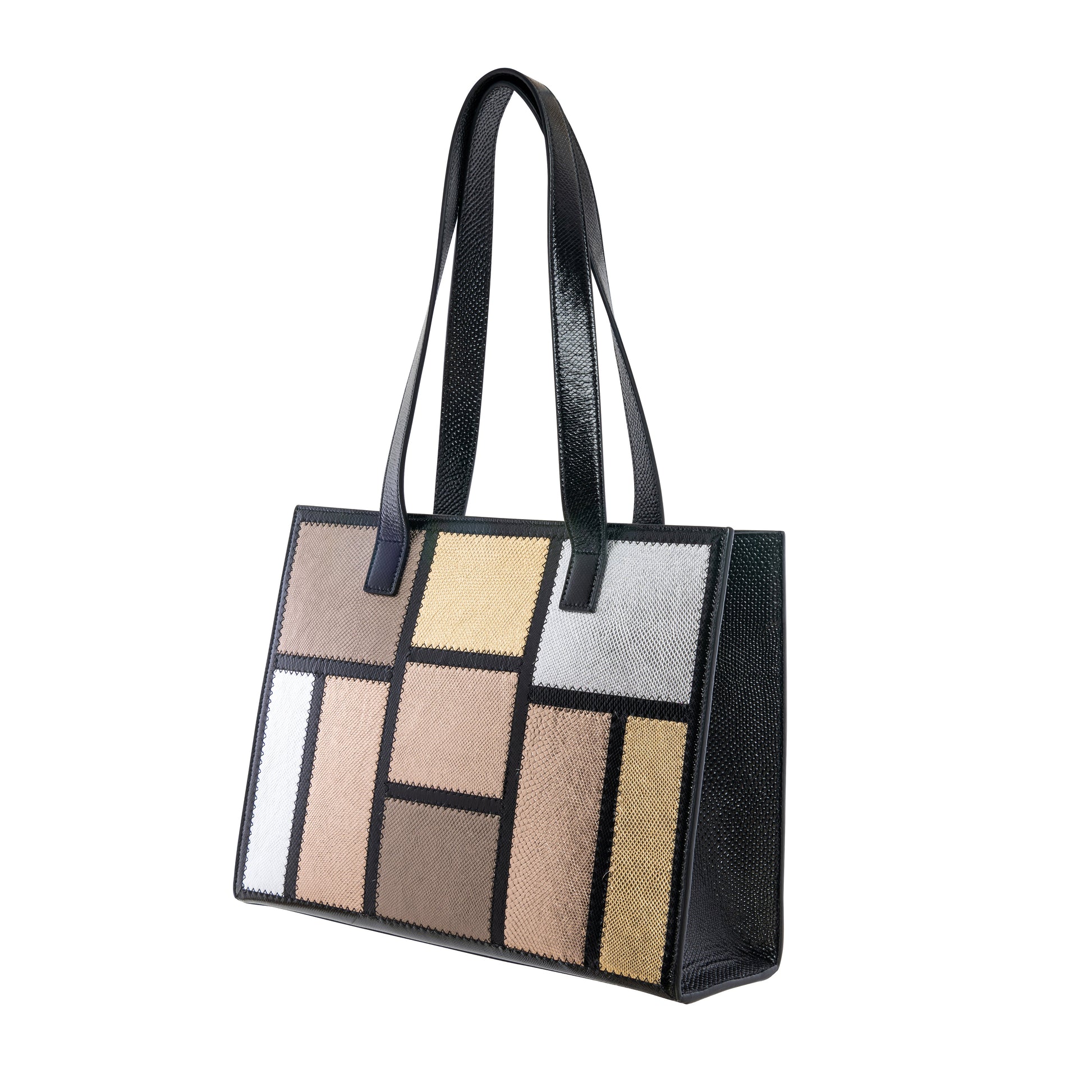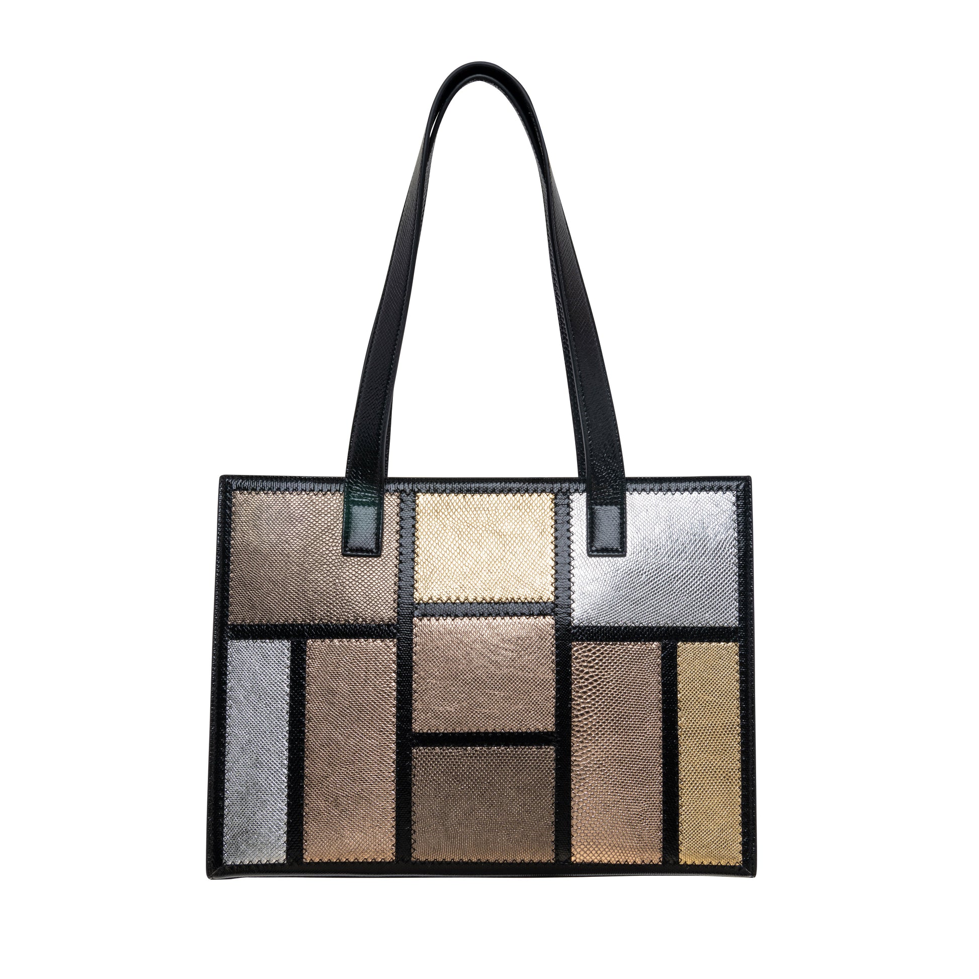 The Sophia has a classic metallic non-endangered Karung patchwork on a black frame with hot pink nappa suede lining. The bag features a full length open pocket, a phone pocket, and a full length zipper pocket that has Sharon’s signature brass poodle. The zip top closure can be worn zipped up, or can be hidden to allow for more open carrying space in the bag.