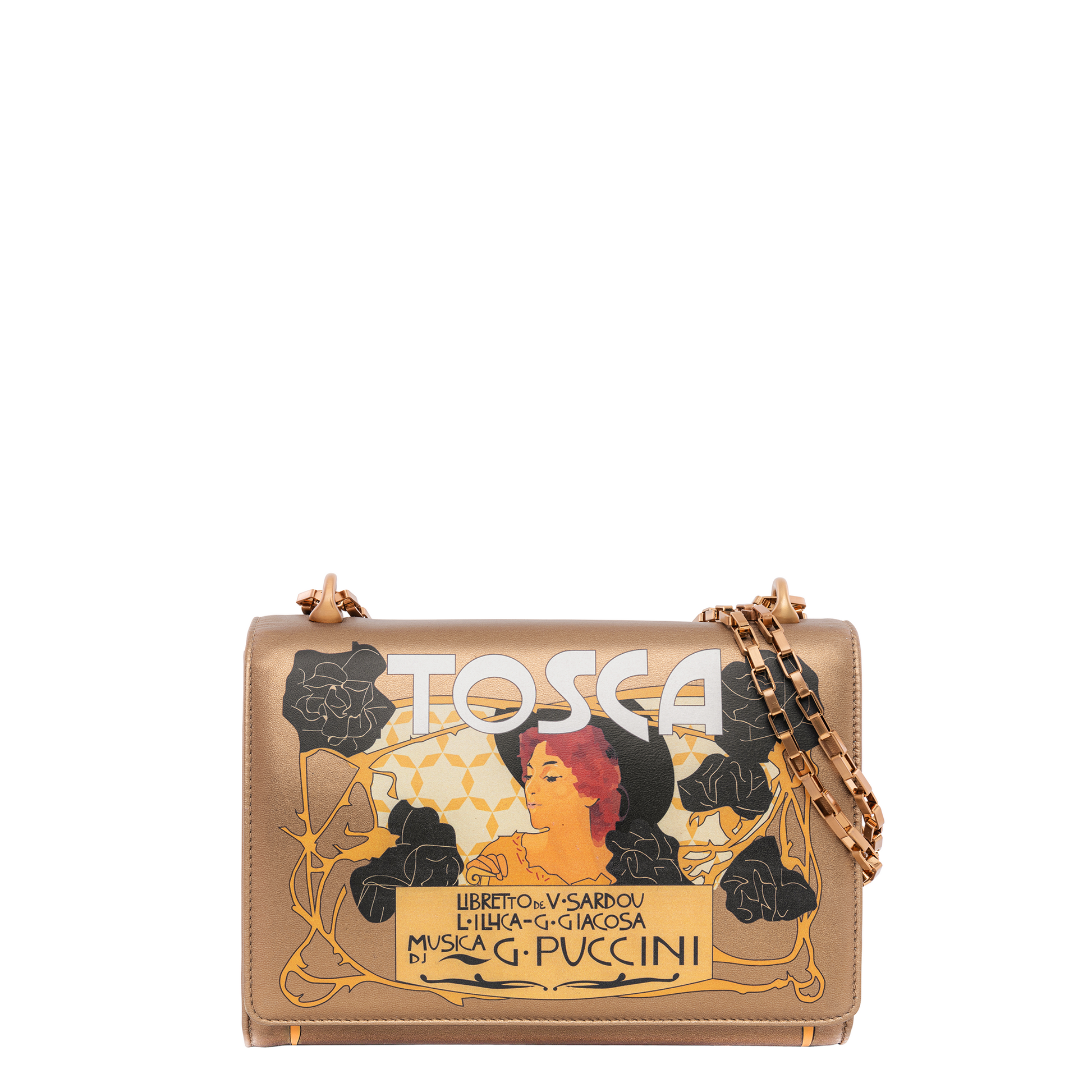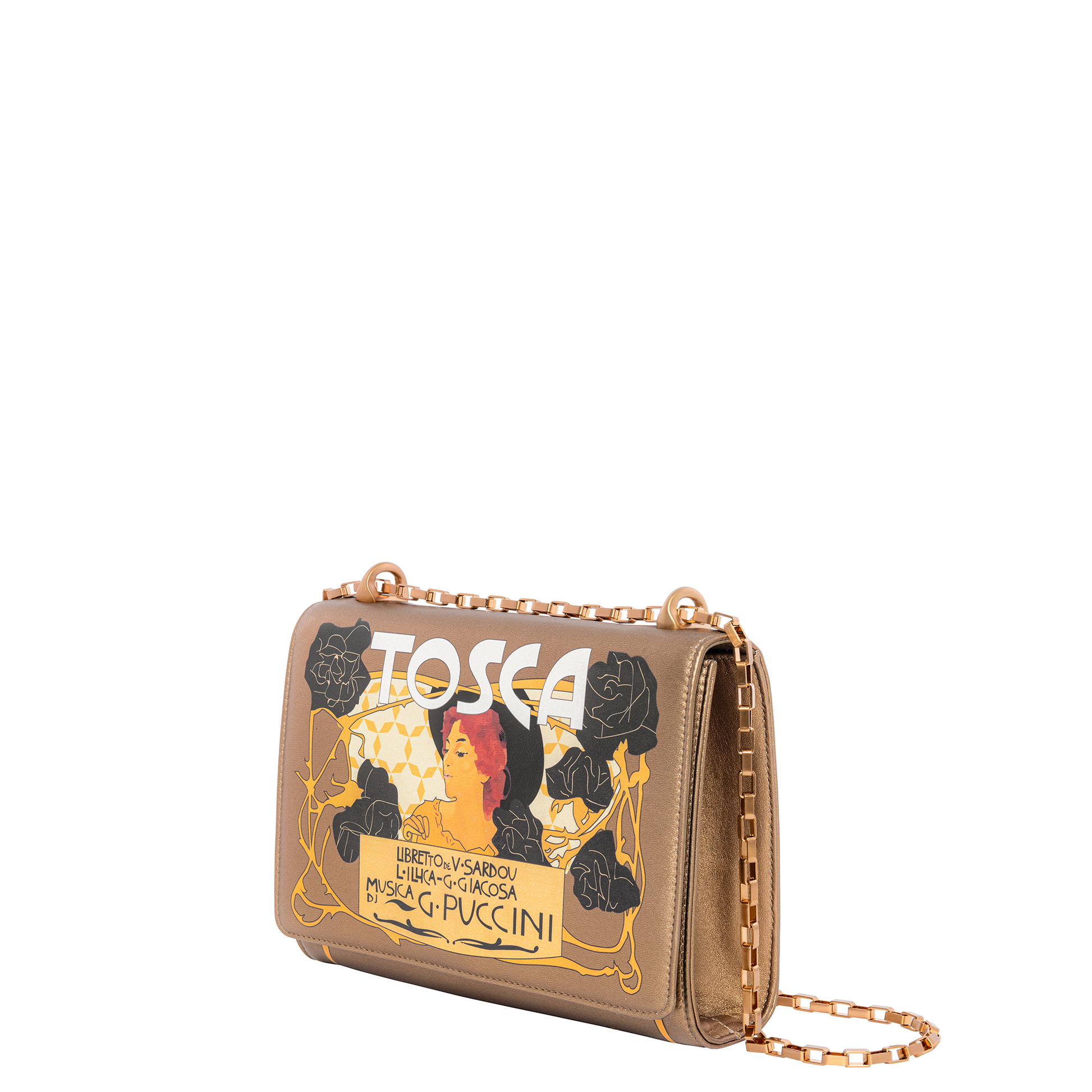 The Roberta Tosca is an elegant shoulder bag that is printed on luxurious lambskin and has a double brushed gold chain that can be worn either short or long on the shoulder. The Tosca is lined in a hot pink silk blend satin, has a lambskin leather trim, and features a double card holder, phone pocket and a zippered pocket that has Sharon’s signature brass poodle.